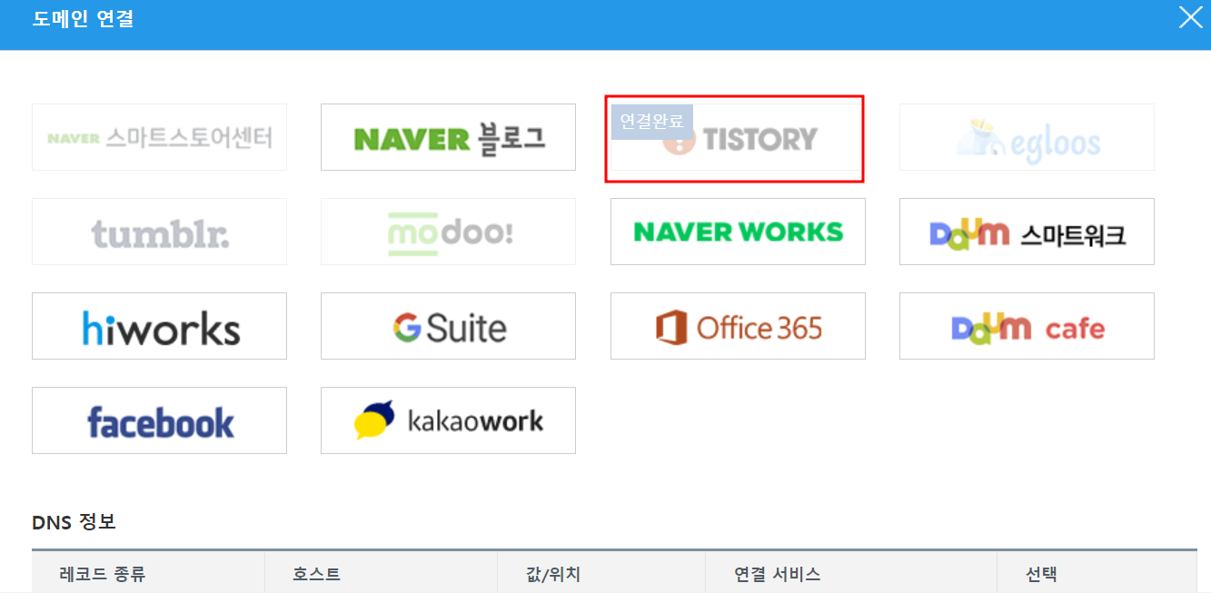 아래 [도메인 연결] 옆 설정클릭 - 아래와 같은 화면이 나오면 티스토리에 연동하기 - 저장