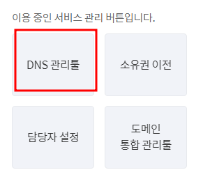 오른쪽 박스항목 중 [DNS관리툴]을 클릭하면 본인이 등록한 도메인이 나옴. => 설정 클릭