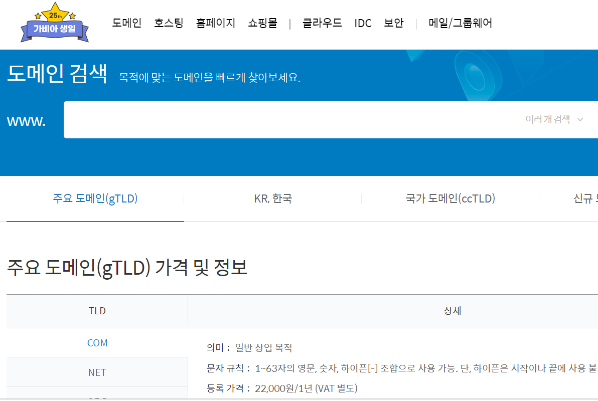 위에 보이듯이 대표적인. com가격 : 22,000원/1년 (VAT 별도)