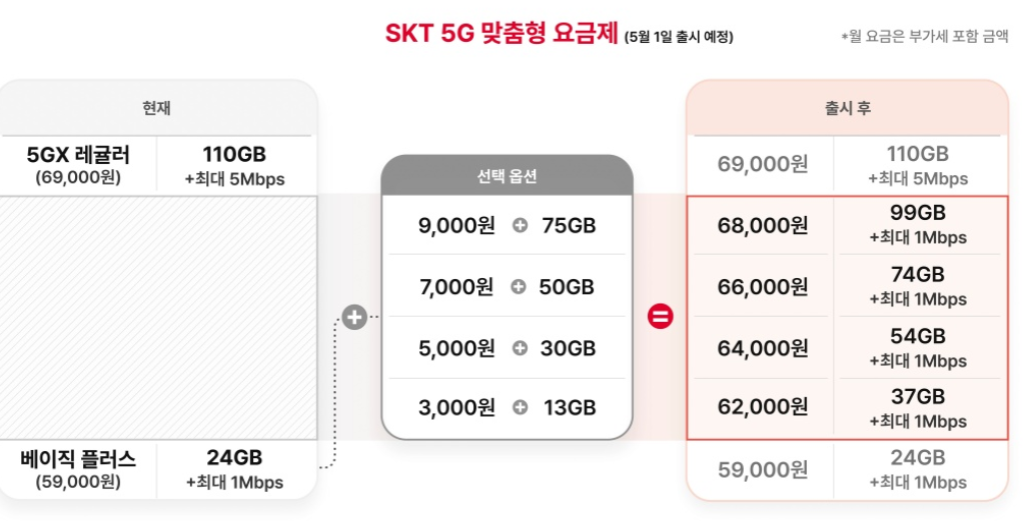 지난해 8월 출시한 5G 중간요금제인 '베이식플러스(월 5만 9000원)'을 기본 뼈대 + 추가 데이터 옵션 4종 중 고객이 하나를 조합해 이용하는 '5G 맞춤형 요금제'를 5월 1일 출시할 예정.